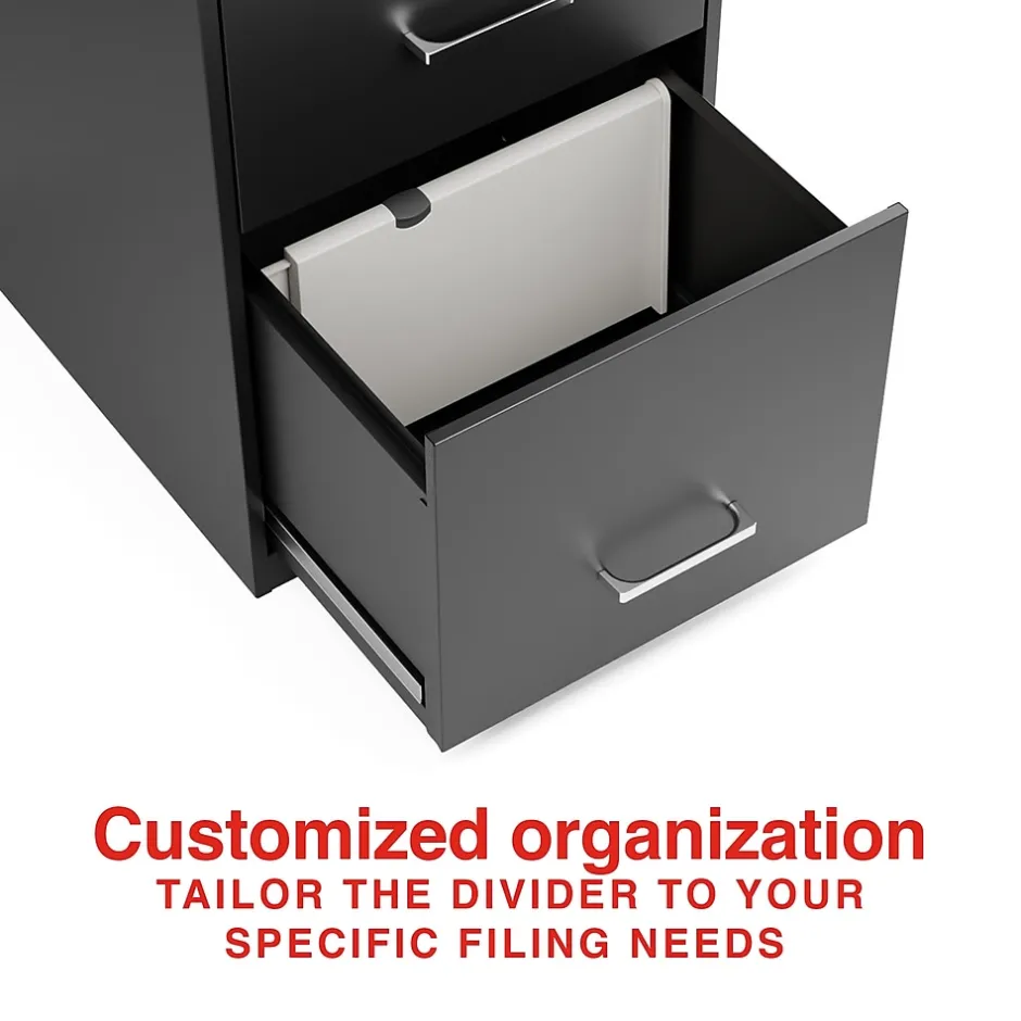 Introducing the Staples Adjustable File Cabinet Drawer Divider, the ultimate solution for maximizing organization and storage efficiency in both vertical and lateral filing cabinets. Designed with versatility in mind, this adjustable divider fits all standard cabinet sizes, allowing you to customize your filing system to meet your specific needs. Simply pull the inside board to the desired length and secure it firmly with the easy-to-use locking mechanism, ensuring your files, folders, and office supplies stay neatly in place. Whether you are managing documents in a home office or creating space for personal items, this innovative divider enhances storage capacity and provides quick, efficient access to your essentials.