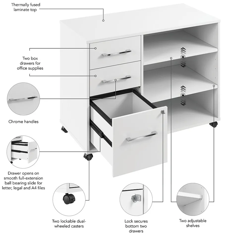 The Bush Business Furniture Hustle Office Storage Cabinet with Wheels provides the form and function needed to support your entrepreneurial spirit without breaking the bank. An ideal choice for small to medium-size businesses and home offices alike, the small cabinet rolls throughout your workspace to provide storage where it’s needed most. The left side features three drawers: one file drawer for letter, legal, and A4-size papers and two box drawers for small office supplies. Drawers can be locked to safeguard sensitive documents as well as valuable items. The office cabinet’s open storage area includes two adjustable shelves for work materials and equipment. This file cabinet with shelves has been meticulously designed and tested to meet or exceed ANSI/BIFMA standards for safety, durability, and performance and is backed by a 10 Year Warranty. American made with U.S. and imported parts.