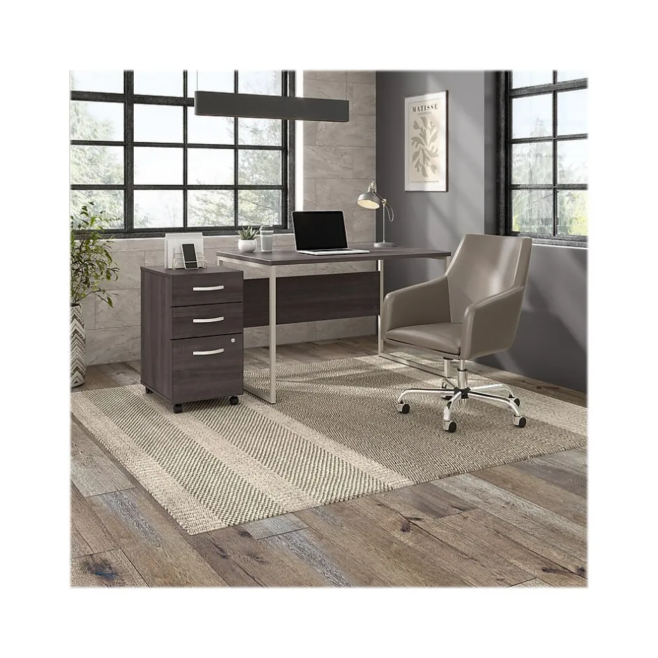 The Bush Business Furniture Hybrid three-drawer mobile file cabinet offers a stylish, long-lasting storage solution for the modern professional. Enjoy a neat and organized workspace with a file cabinet that conveniently rolls wherever you need access to important documents. The file drawer opens on smooth full-extension ball bearing slides for an effortless reach to letter, legal and A4-size paperwork, while a pair of box drawers organize writing utensils, notepads and more. The two bottom drawers can be secured by a single lock to protect sensitive files or personal items. The rolling file cabinet’s compact design allows it to fit underneath a standard-size office desk for a space-saving configuration. Find the perfect look for your space with five contemporary finish options: black walnut, modern hickory, platinum gray, storm gray, and white. This two-drawer file cabinet with wheels has been meticulously tested to meet or exceed ANSI/BIFMA quality standards for safety, durability, and performance and is backed by the Bush Business Furniture 10-year manufacturer warranty. See the full Hybrid collection for coordinating items to enhance your workspace as needed, including computer desks, bookcases, and storage cabinets (coordinating items sold separately). American-made with US and imported parts.