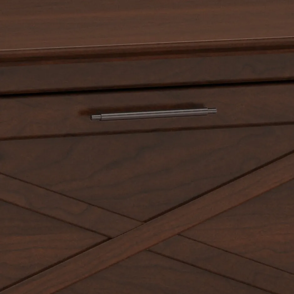 The Bush Furniture Key West 2 Drawer Lateral File Cabinet provides a casual storage component that works in any room. The unique X pattern accent on the drawer panels has a relaxed style with a sturdy and attractive post leg design. Key West features the look of natural reclaimed wood with an authentic Bing Cherry finish with Aged Bronze hardware accents. Two file drawers accommodate letter and legal size files and are built with full extension ball bearing slides. This filing cabinet matches the height of any Key West Desk. Meets ANSI/SOHO standards for safety and performance and is backed by the Bush Furniture 1 Year Manufacturer’s Warranty.