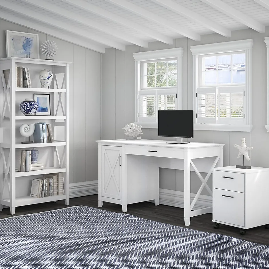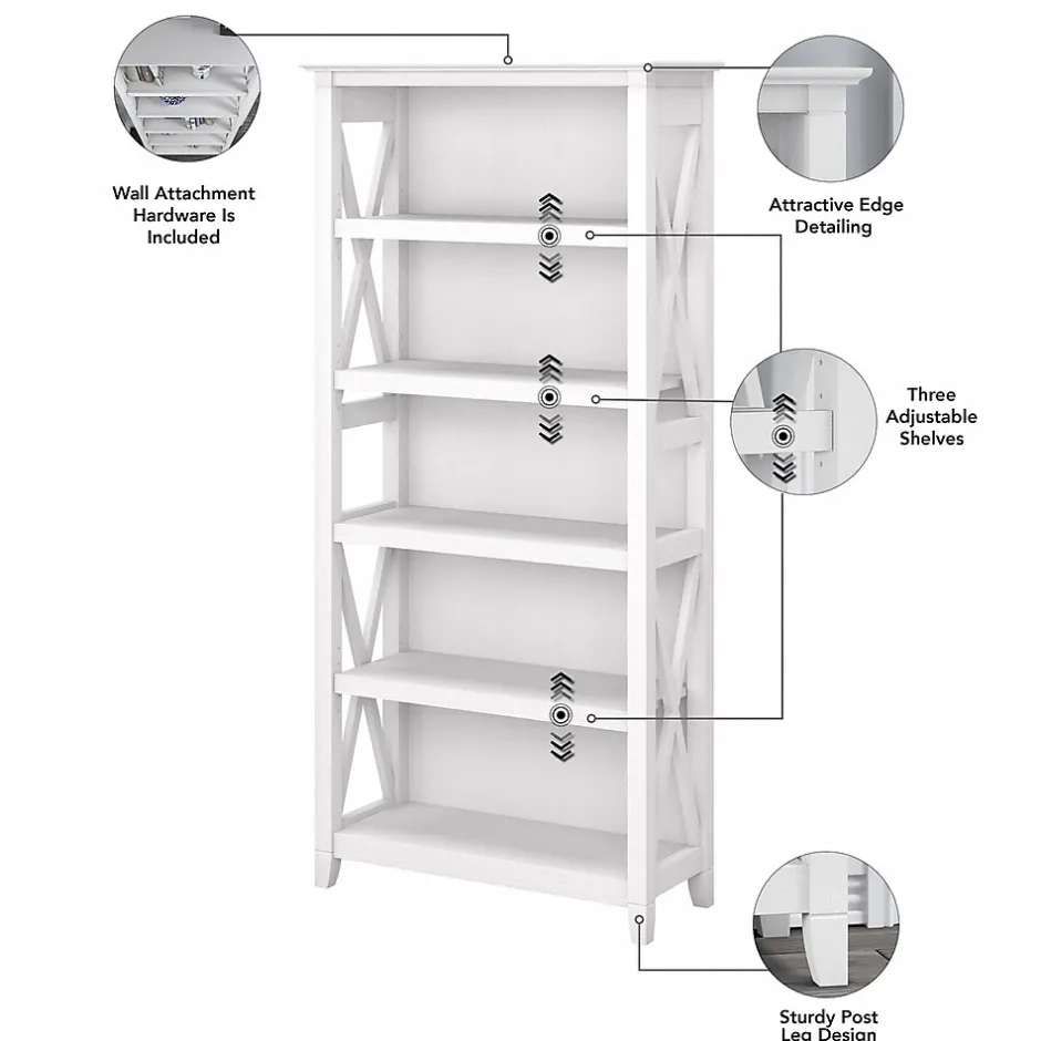The Bush Furniture Key West five-shelf bookcase is a perfect way to show off your favorite artwork, photos, plants, and more. Three adjustable shelves accommodate items of various sizes while two fixed shelves provide stability. Each shelf supports up to 25 lbs. so you can store your personal library and display decorations with confidence. Stylish touches include unique X pattern accents on the side panels as well as a sturdy and attractive post leg design. This five-tier bookcase includes wall attachment hardware for family-friendly safety and security in any home office or living room. A perfect choice for homes that embrace cottage, coastal, and farmhouse decor, the Key West collection includes a variety of coordinating items to expand your space as needed. This tall bookcase is tested to meet ANSI/SOHO quality standards for safety and performance and is backed by a 1-year warranty.