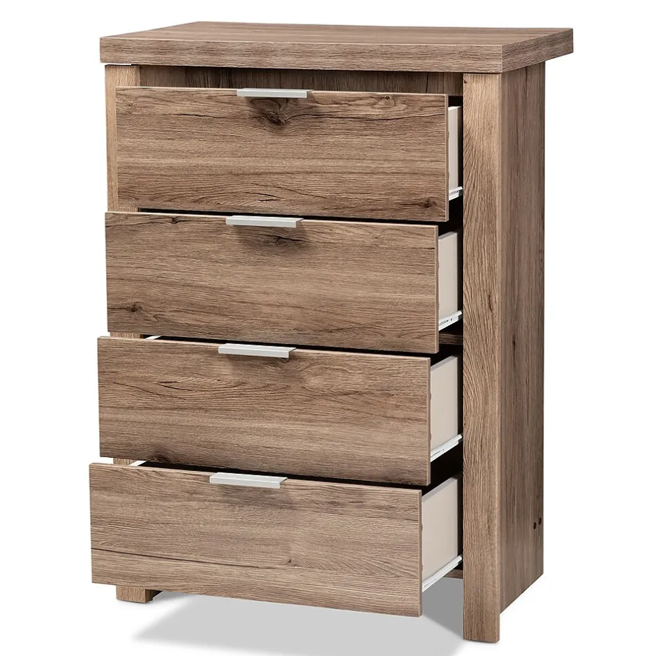 The Laverne 4-drawer chest is an essential piece of furniture that is both charming and simple. The modern and contemporary-inspired design is exemplified in the rectangular, geometric silhouette. The Laverne is finished in a natural oak brown to give you a hint of rustic and natural vibes. The chest features convenient top side drawer pulls on each of the four drawers, which roll out smoothly on slides. The minimalist chest, with its neutral coloring, will be easy to coordinate with the decor in your bedroom or guest room. The Laverne can even serve as additional storage in your entryway, living room, or closet. Made in Malaysia, the chest requires assembly.