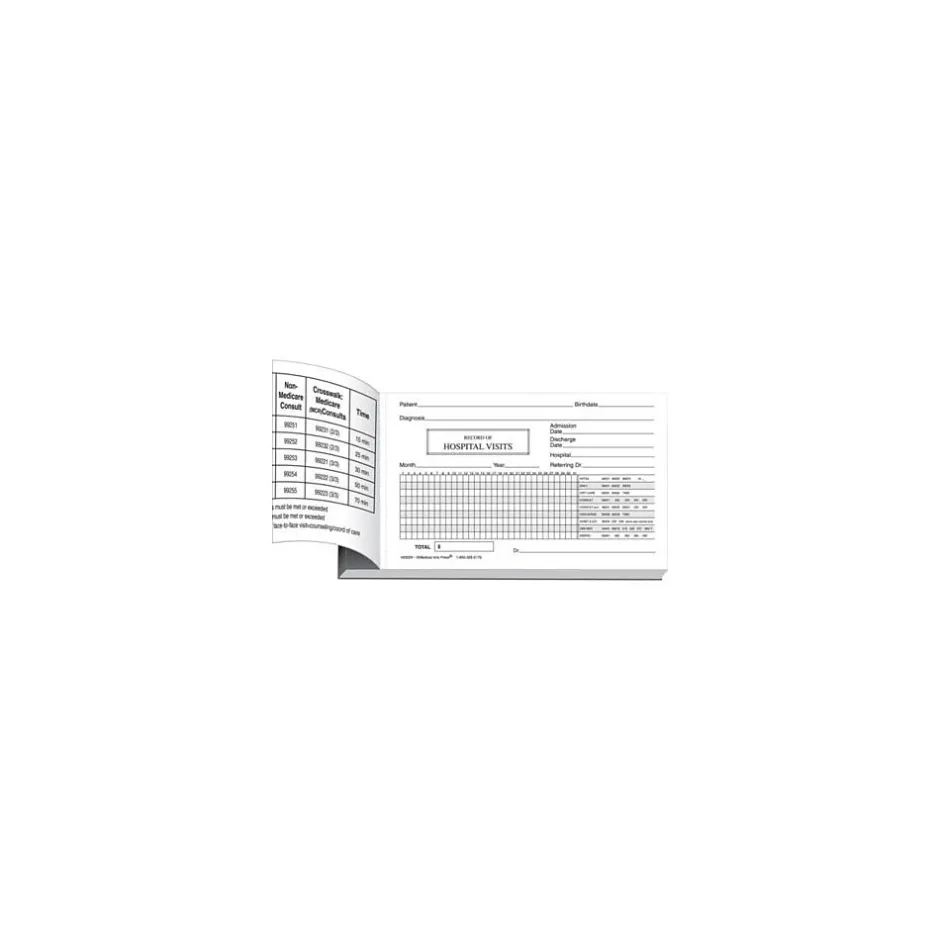 Medical Arts Press Pocket-Sized Log of Hospital Visits allow you to check mark or write the level code for each patient. They feature helpful charts on the inside cover and are available in 25/book.