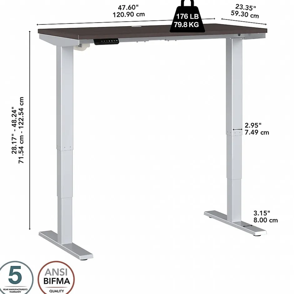 Bush Business Furniture’s Move 40 Series Electric Height Adjustable Standing Desk is a perfect way to build an ergonomic workspace without the high-end price tag. The 48W x 24D desktop lifts anywhere from 28 to 48 inches from the floor at a speed of 1.25 inches per second. The control panel includes four programmable presets that save your favorite heights so you can change positions without missing a beat. The Adjustable Desk also features an Anti-Collision Sensor that stops movement up or down if an object is detected. Built to endure the rigors of a busy professional environment, the thermally fused laminate work surface resists scratches and stains while a welded 16-gauge steel base allows the desktop to support up to 176 pounds. This Ergonomic Office Desk has been tested to meet or exceed ANSI/BIFMA standards for safety, durability and performance and is backed by a 5 Year Warranty.