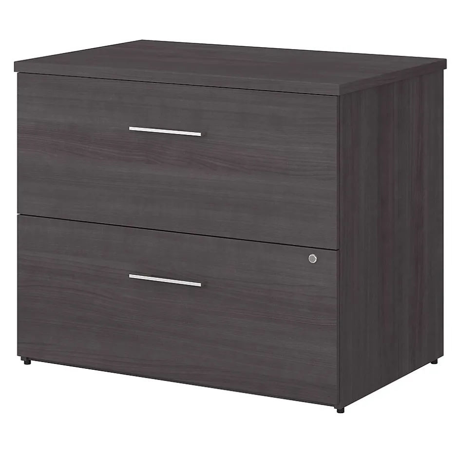 The Bush Business Furniture Office 500 two-drawer lateral file cabinet offers secure storage with a sophisticated look that fits the modern workplace. Organize important paperwork safely and efficiently with this lateral file cabinet. A great addition to any workspace, this file cabinet features two large drawers that accept legal-, letter-, and A4-size documents while supporting up to 88 lbs. each. Both drawers open on full-extension ball bearing slides for an easy reach to contents and are secured by a single lock to protect files that contain sensitive information. Drawers open one at a time for maximum stability, and the base includes adjustable levelers to compensate for uneven floors. One file cabinet accepts the coordinating 36″W bookcase hutch while two can accept a 72″W desk hutch (hutches sold separately). This locking file cabinet meets or exceeds ANSI/BIFMA quality standards for safety and performance and is backed by a 10-year manufacturer limited warranty. American-made with US and imported parts.
