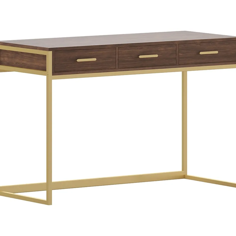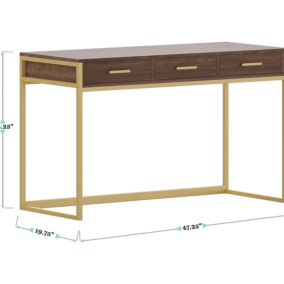 - Comes in modern style, featuring a slim engineered wood desktop in a walnut melamine finish and sturdy metal base and hardware in a polished brass finish