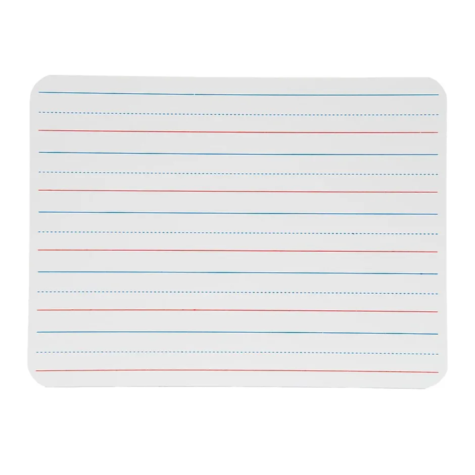 Two-sided red & blue ruled dry erase boards are great for teaching and practicing fundamentals at the early learner stage. Bright white board contains 5 sets of blue headline and broken mid-line plus red baseline format. Each line set measures 1-1/8″ with 3/8″ of blank descender space between sets. Back side is plain white dry erase. Boards feature a high-quality, non-ghosting write-and-wipe surface with smooth, rounded edges and corners. Hardboard backing will not warp or chip. Measure 12″ x 9″ x 0.125″ thick. Sold as a pack of 4.