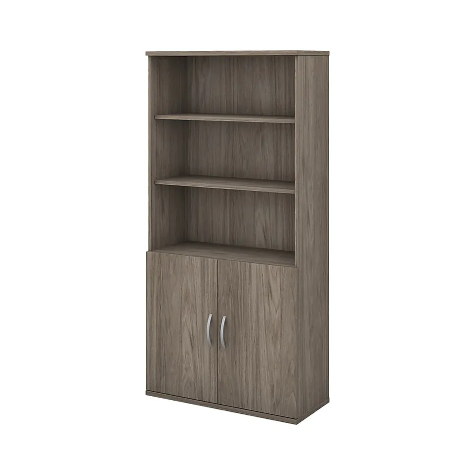 The Bush Business Furniture Studio C five-shelf bookcase with doors looks great, works hard, and adjusts to fit the needs of your office. Designed with two fixed and three adjustable shelves, the bookcase holds your books and reference materials with plenty of room for your favorite decorative accents. Confidently store a variety of items on the spacious and durable shelves, designed to hold up to 50 lbs. each. A thermally fused laminate finish fends off everyday damage such as scratches and stains throughout years of everyday use. Two doors with smooth Euro-style hinges conceal your office supplies and add an eye-catching touch to your workspace. This tall bookcase with doors comes with a 10-year warranty and meets ANSI/BIFMA quality test standards. See the full collection for coordinating items available to make your office your own with Bush Business Furniture Studio C. American-made with US and imported parts.