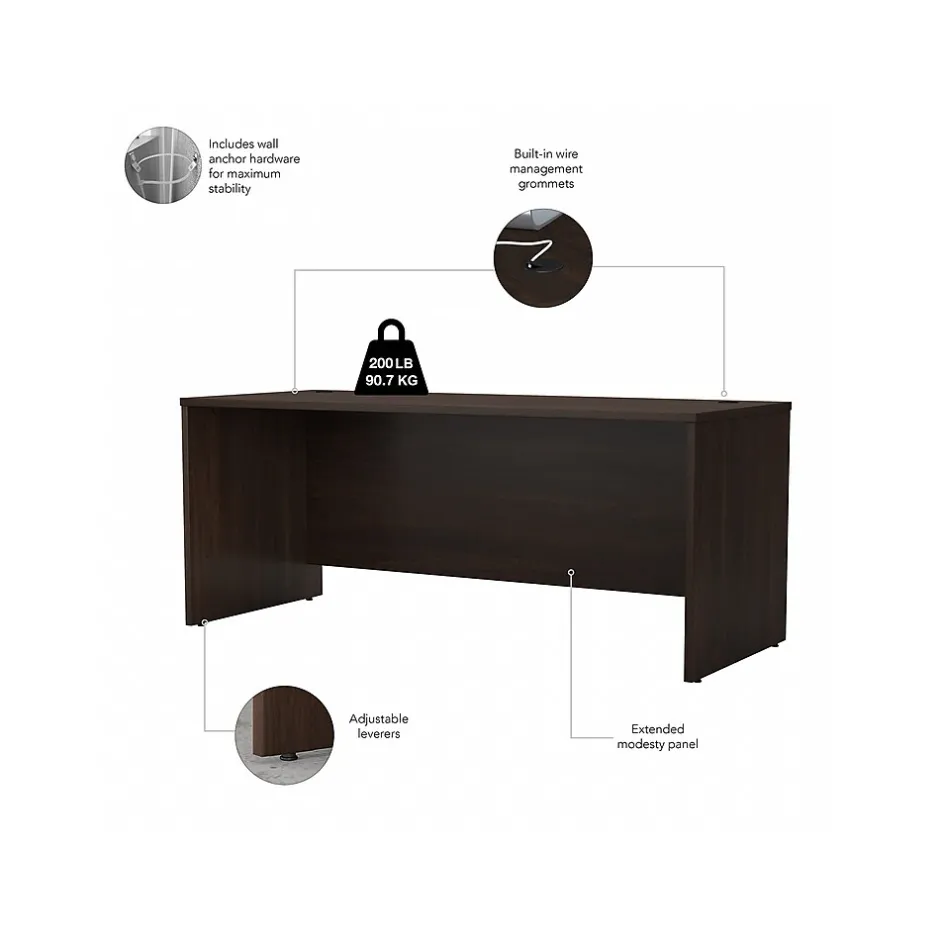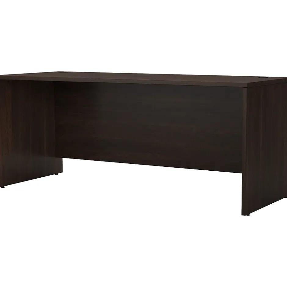 Choose the Bush Business Furniture Studio C 72″W office desk for a durable design that works hard for years with a fresh finish that looks great anywhere. A thick surface, an extended modesty panel, and clean lines convey a classic look that’s available in several contemporary or traditional finishes to fit any workspace. The thermally fused laminate finish, durable edge banding, and sturdy end panels resist scratches, stains, and dents while standing up to the rigors of a 40-plus hour work week. Keep pesky computer cords out of your way with an integrated cable management system for an organized work surface. This computer desk is backed by a 10-year manufacturer’s warranty and meets ANSI/BIFMA quality test standards for safety and performance. See the full collection for coordinating items available to make your office your own with Studio C. American made with U.S. and imported parts.