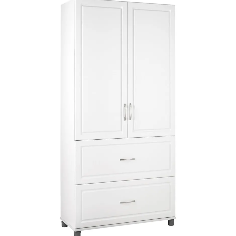 Satisfy all your storage needs with the SystemBuild Kendall 36” 2 Drawer/2 Door Storage Cabinet. Whether you need a place to store kitchen bowls and appliance or somewhere to place extra towels and bed sheets, this Cabinet is the perfect choice. Behind the doors, 3 shelves offer plenty of room for items that need a home. Two of the shelves are adjustable to meet your specific storage needs. The 2 roomy drawers provide additional easy-access storage space. The 36” 2 Drawer/2 Door Storage Cabinet features a crisp white finish that creates a refined, clean look in your home. Use this piece as a stand-alone item, or combine it with additional SystemBuild Kendall storage items to create the perfect storage solution for your home. SystemBuild 36” 2 Drawer/2 Door Storage Cabinet requires assembly upon delivery.