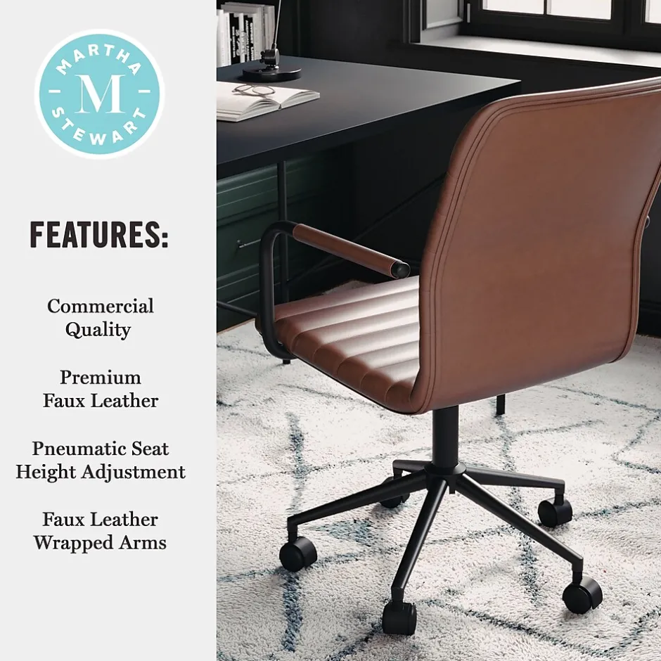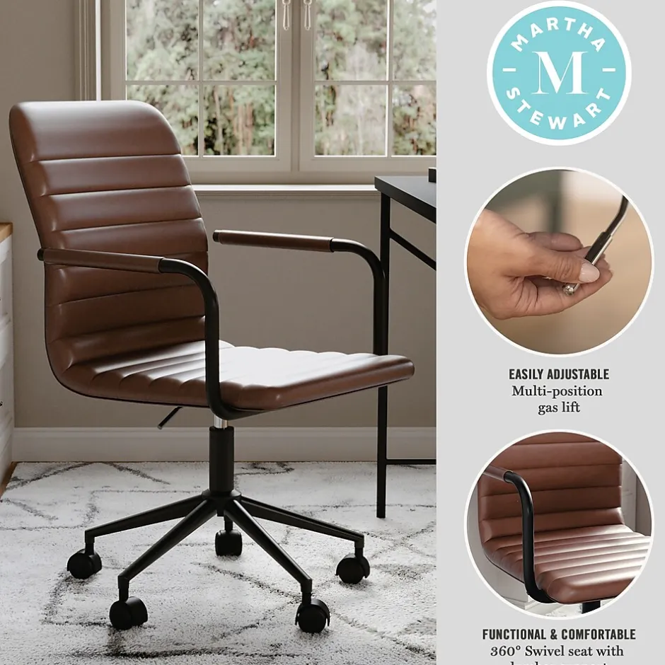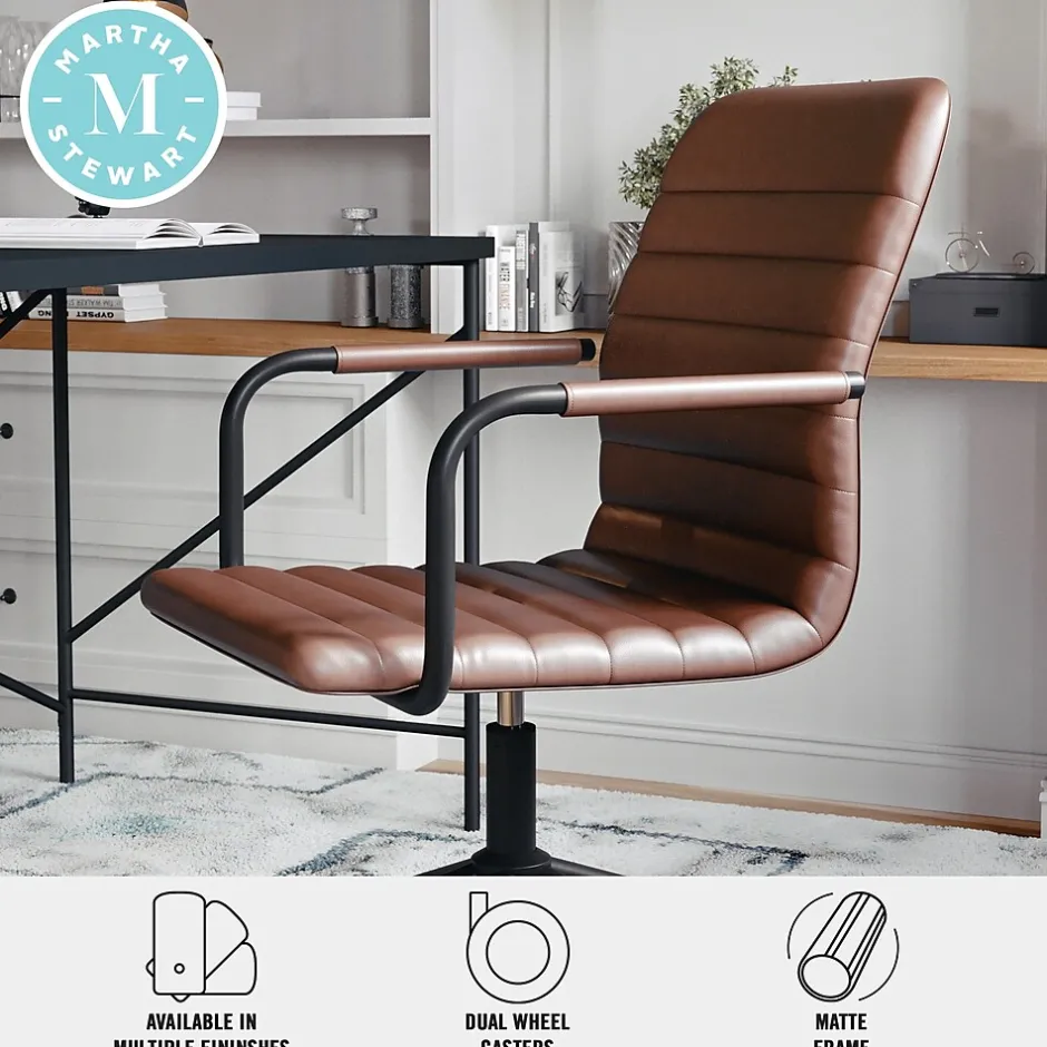 The Martha Stewart Taytum Office Chair partners traditional design with clean lines to instantly update your work space. This faux leather desk chair features a polished nickel frame with integrated armrests that add elevated sophistication to a classic look. A pneumatic height adjustment lever tucked beneath the 360° swivel seat offers a custom seating experience to keep you comfortable throughout your workday. Assembly is easy with the included tools and step-by-step instructions.