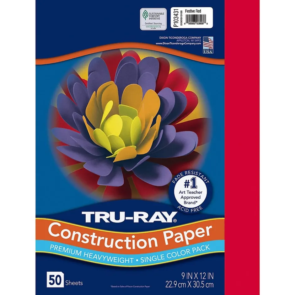 Ideal for cutouts and bulletin board displays, the Pacon Tru-Ray Festive Red Construction Papers resist fading and keep your artwork bright for a long time. These art papers are heavyweight and do not crack or tear while scoring, curling or folding. Manufactured from 50 percent recycled fiber content, these sulphite construction papers are eco-friendly.