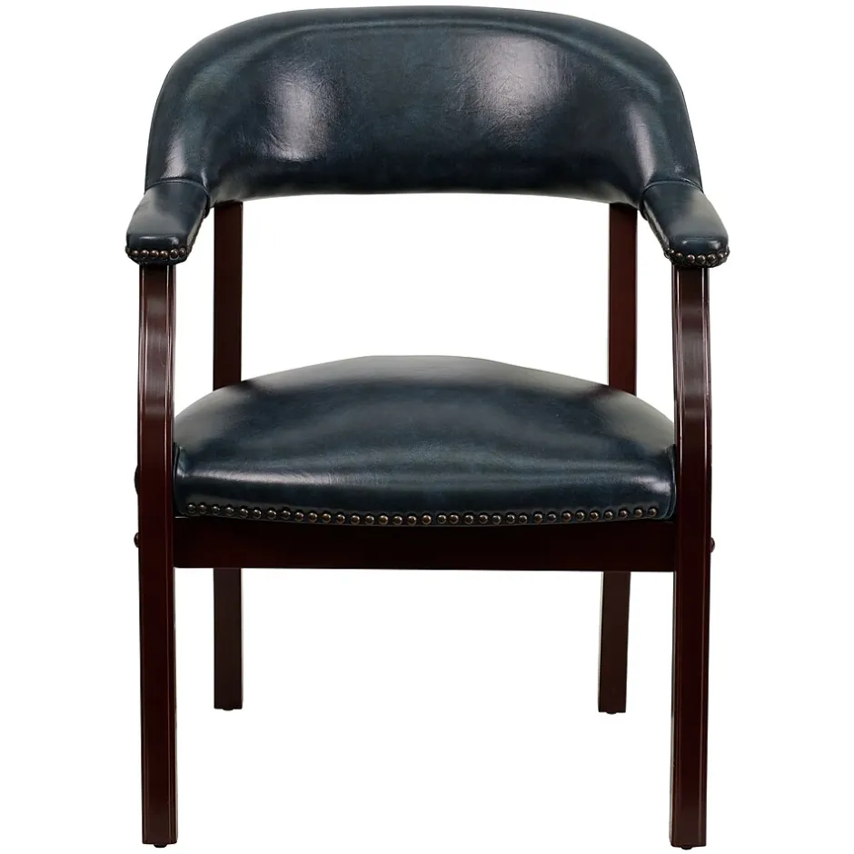 Easy to clean and convenient, the Flash Furniture Conference Chair has navy blue vinyl upholstery to withstand the rigors of daily use. This conference chair is equipped with upholstered arms for resting your forearms comfortably. With the contoured open-back design, this chair helps you sit in a correct sitting posture. The brass nail trims on arms and seat lend an elegant appearance to the navy chair. For maximum comfort and greater safety, this functional chair is designed with CA117 fire retardant foam cushions.