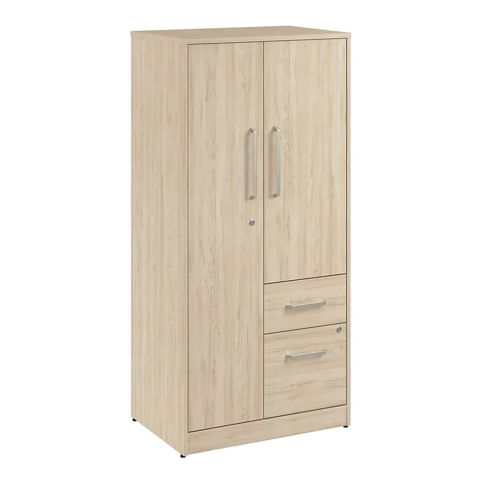 The Bush Business Furniture Vista Wardrobe Cabinet with Drawers keeps any office or workspace organized and clutter-free, adding a modern touch and extra storage where it’s needed. The cabinet features two adjustable shelves behind the left door and two adjustable and one fixed shelf behind the right door. Cabinet doors feature smooth self-closing, Euro-style hinges, and the drawers open smoothly on full-extension ball bearing slides. Thoughtfully designed for maximum stability and includes an optional wall anchor and adjustable levelers. Available in several contemporary finishes paired with attractive brushed nickel hardware. Bush Business Furniture’s commitment to safety includes rigorous testing that meets or exceeds ANSI/BIFMA x5.5 commercial test standards. Backed by a 10 Year Manufacturer’s Warranty and made in North America with globally sourced materials.