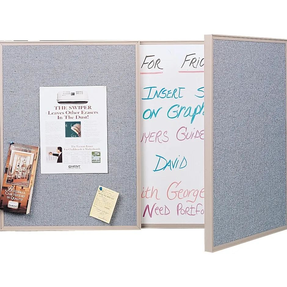 Ghent’s VisuALL PC, developed for individual offices, panel systems and small meeting rooms, combines an erasable non-magnetic whiteboard surface with a useful fabric bulletin board. Fabric options available are Beige, Blue or Gray. The outer fabric bulletin board hinges open from the center to reveal the whiteboard or closes for privacy. Compact enough for small spaces, the VisuALL PC is surprisingly generous in size.