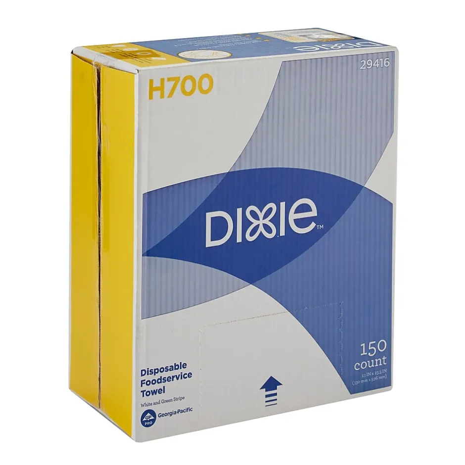 The Dixie strong, soft, thick and absorbent foodservice towel is engineered from super strong hydro entangled fibers that make it perfect for front or back of the house cleaning. These white with green stripe, medium duty towels deliver superior cloth-like cleaning to handle almost any job and are especially designed for fast, streak-free wiping on messy tabletops, grimy countertops, and even the greasiest stove tops. You name it-this wiper can handle it. Long-lasting, machine-washable towels come in a convenient dispenser box for added protection and quick, easy dispensing.