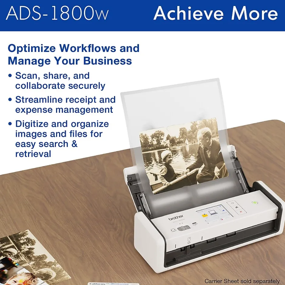 Great for scanning in the office or on the go, the Brother ADS-1800W scanner easily handles a wide variety of document sizes, scanning single pages as long as 197″ or multiple pages up to 8.5″ x 14″ with the 20-page automatic document feeder(1). It even includes a handy card slot for simple scanning of ID cards, business cards, or plastic cards of all kinds. Scan what you want, your way, almost anywhere – from your desktop, or using the free Brother Mobile Connect App(2) from your smartphone when connected to your scanner over a Wi-Fi connection. The handy 2.8” color touchscreen makes scanning even simpler, letting you scan to preset destinations, create shortcuts, and easily manage your scanner settings. Save directly to your favorite cloud service(3), or send to your computer, email, or USB flash drive. You won’t believe the time – and space – you’ll save with fast scanning speeds up to 30 pages per minute (ppm)(4), and single-pass double-sided scanning capabilities. Directly powered from your computer via an included USB-C cable, the Brother ADS-1800W is compatible with Windows, Mac®, and Linux® operating systems, offering TWAIN, WIA, ICA, and SANE drivers. It’s also ENERGY STAR 3.0 and EPEAT SILVER certified, with energy efficient options like Sleep Mode. It’s so simple to use, you’ll ask yourself how you ever organized without it.