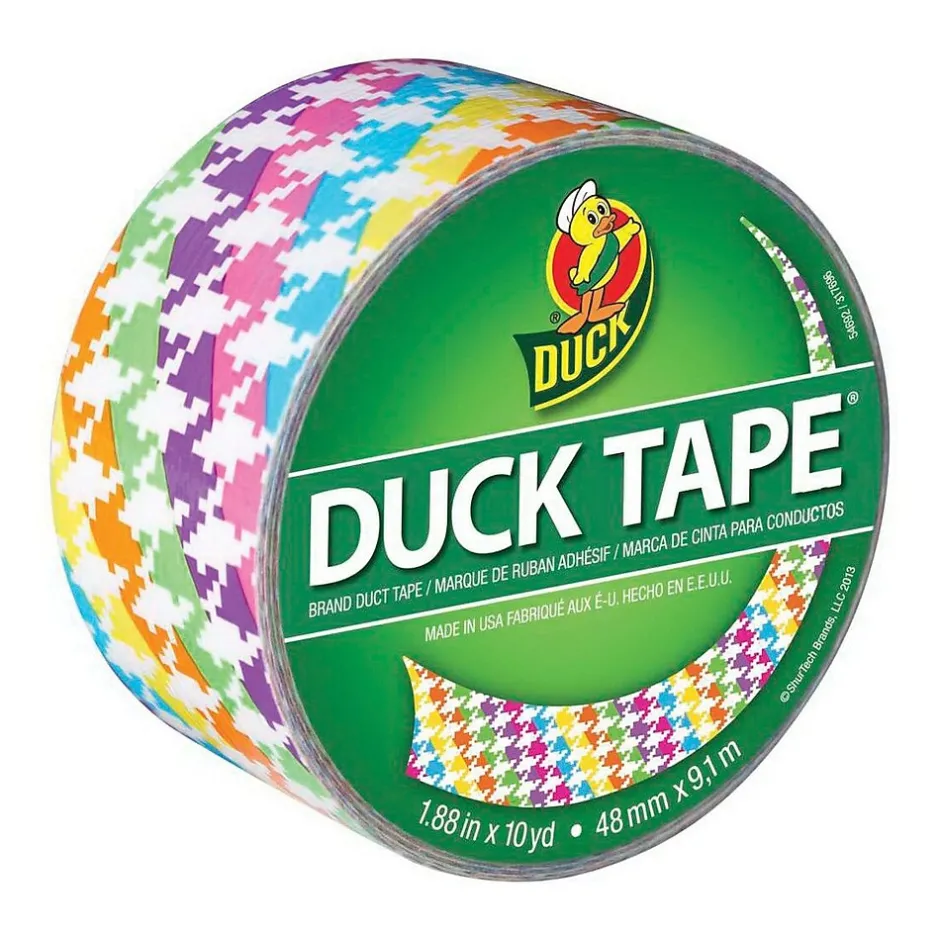 The Duck® 10 yds neon printed duct tape is suitable for repair, crafting, decorating and fashion projects. This houndstooth patterned tape ensures elegant look. This tape features rubber adhesive ensures easy application. This tape tears easily by hand without curling and conforms to uneven surfaces.