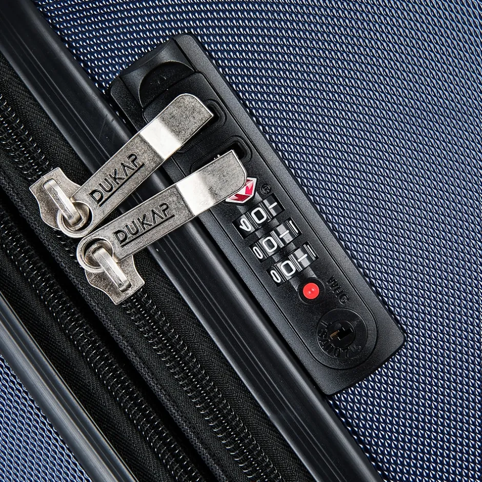 The DUKAP Intely luggage set is made of lightweight PC/ABS engineered material with a micro-diamond finish. The hard-flex construction offers maximum strength, durability, and a water-/scratch-resistant finish. Protective corner bumpers withstand higher impacts, and four side studs allow the luggage to stand upright. It also features a push-button locking internal retractable trolley system.