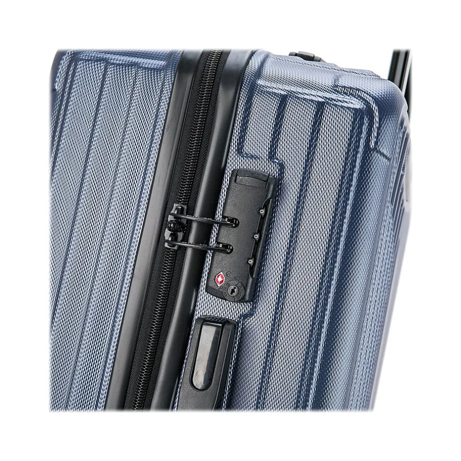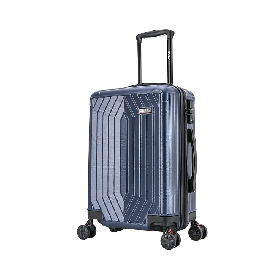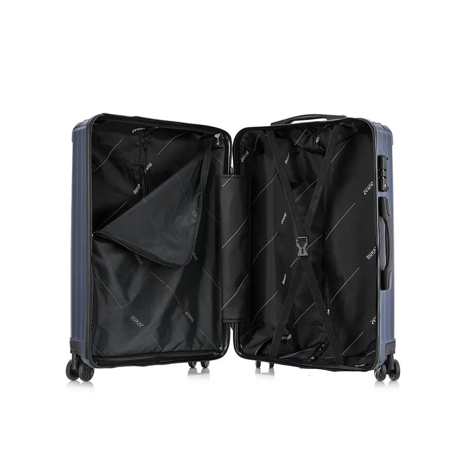 The hard-flex construction of this DUKAP STRATOS carry-on four-wheel spinner luggage offers maximum strength, durability, and a water-/scratch-resistant finish. It features a full interior fabric lining with a zipper compartment on one side and snap-on straps on the opposite side for easy packing.