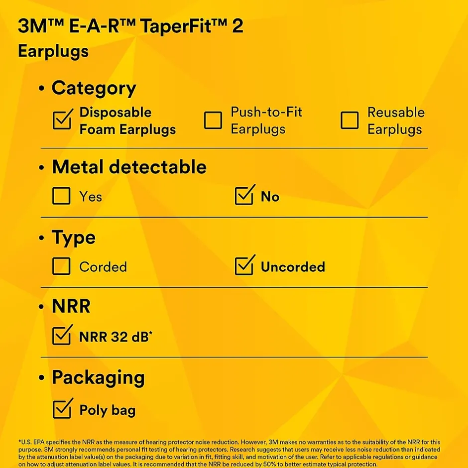 3M E-A-R TaperFit 2 corded ear plugs provide a comfortable, individualized fit and excellent attenuation. Its smooth foam expands in the ear canal to help provide comfortable hearing protection. The TaperFit 2 Ear Plugs feature a tapered design that easily and comfortably fits into the ear to help reduce your noise exposure. Simply roll the earplug between your fingers, insert it in the ear canal. The low-pressure foam expands for a snug yet gentle fit that helps block high noise levels. Bright yellow color allows supervisors to conduct a quick visual hearing protection compliance check. Recommended applications include assembly and mechanical, chipping, chiseling, cleaning, drilling, furnace operations, grinding, heavy equipment operations, machining, metal repair, painting, pouring/casting, power fastening, riveting, sanding, sawing and welding. These earplugs are commonly used in the following industries: agriculture, automotive, chemicals, construction, general manufacturing, healthcare, oil and gas, and pharmaceuticals.