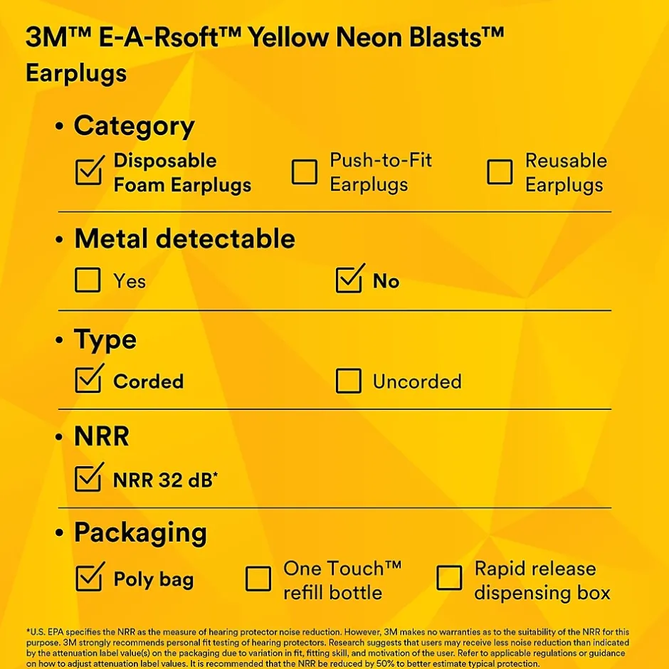 The 3M E-A-Rsoft Yellow Neon Blasts Corded Ear Plugs seal the ear canal with soft, slow-recovery foam for excellent noise reduction and reliable hearing protection. The tapered ear plugs are easy to roll down and insert, then expand within the ear canal for a comfortable, secure fit. Recommended applications include assembly and mechanical, chipping, chiseling, cleaning, drilling, furnace operations, grinding, heavy equipment operations, machining, metal repair, painting, pouring/casting, power fastening, riveting, sanding, sawing and welding. These ear plugs are commonly used in the following industries: agriculture, automotive, chemicals, construction, general manufacturing, healthcare, oil and gas, and pharmaceuticals. These ear plugs have a Noise Reduction Rating (NRR) of 33 dB. Ear plugs are made of a polyurethane. Test compatible with 3M E-A-Rfit Validation System.