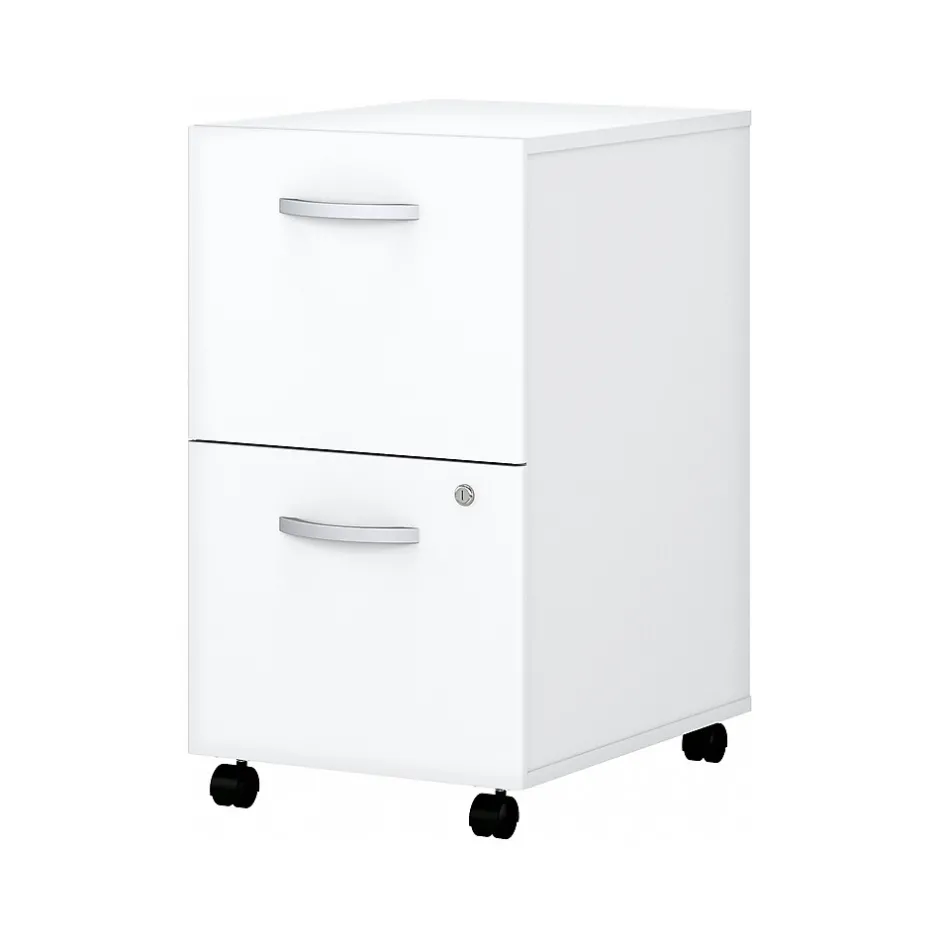 The Bush Business Furniture Easy Office two-drawer mobile file cabinet presents a perfect solution for adding storage to any professional workplace. With its dual-wheel casters and finished back, the portable file cabinet provides convenient access to legal-, letter-, and A4-size paperwork anywhere in your office. Drawers open on smooth full-extension ball bearing slides for an effortless reach to contents and can be locked to securely store documents with sensitive information. Find the perfect look for any office environment with traditional and contemporary finish options, both of which feature stylish brushed nickel drawer pulls.
