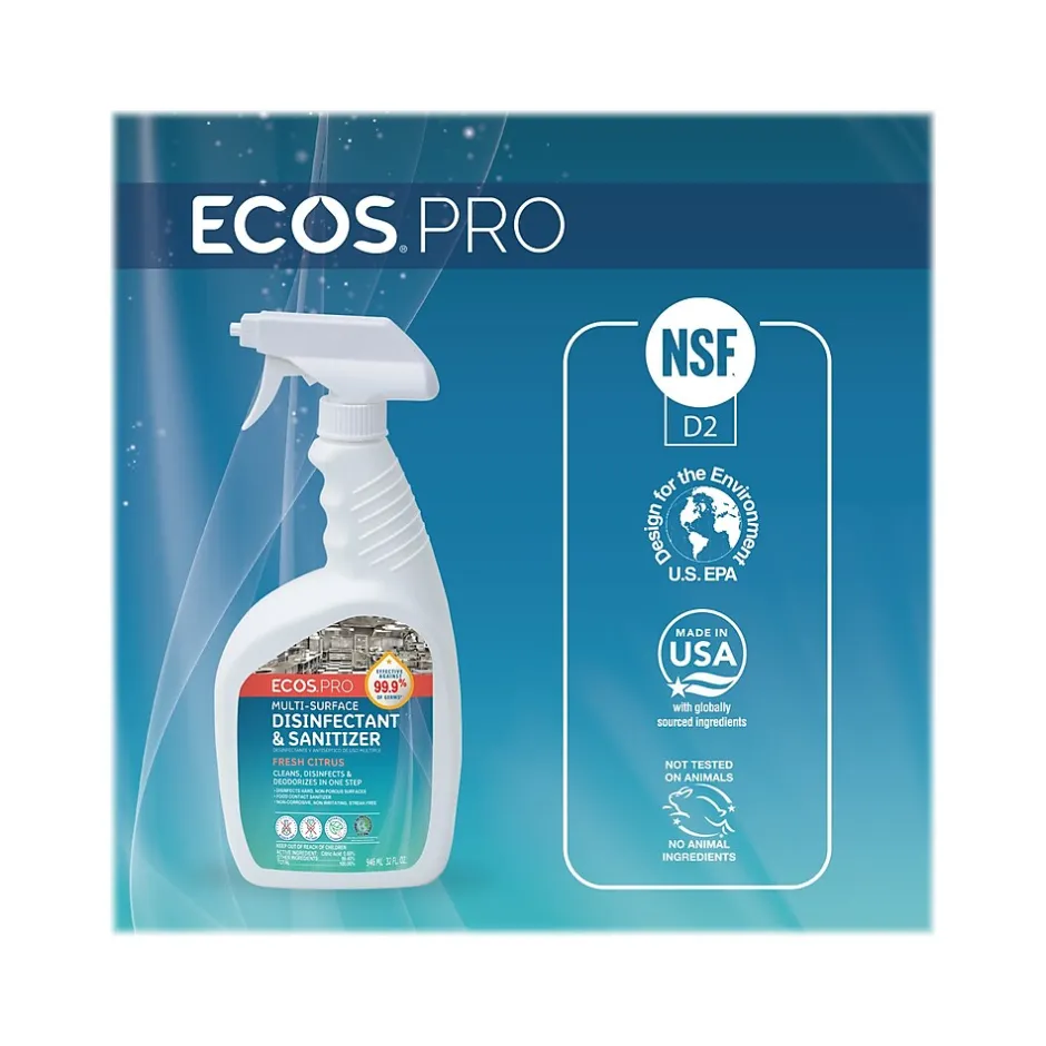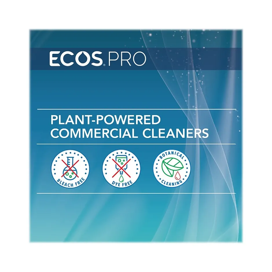 Effective against 99.9% of germs, the ECOS PRO multi-surface disinfectant and sanitizer cleans, disinfects, and deodorizes in one step. Its formula harnesses the power of botanical cleaning to disinfect hard nonporous surfaces. No rinsing is required when sanitizing food-contact surfaces (NSF D2) or children’s toys. It is dye-, bleach-, alcohol-, and phenol-free. Noncorrosive, nonirritating, and no harsh fumes for the user. Residue-free and streak-free. Safe for use around kids and pets when used as directed.