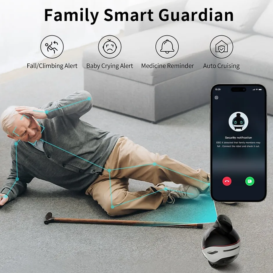- EBO X is Your Smart Guardian at home, which can provide Elderly Fall Alert, Crying & Call-for-Help Alert, Climbing Alert, Facial Recognition & Medication Reminder, Stranger Alert and Fixed-location & Auto Cruising Security.