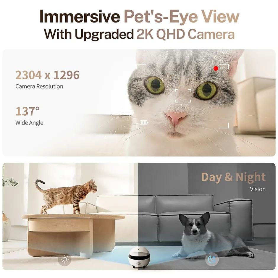 Movable Pet Camera with 2K Resolution: The pet camera indoor provides 2K ultra HD resolution. With freely movable design allows you to control the direction and speed of ROLA Mini movement via ROL APP and view your home anytime, anywhere without blind spot areas, supports 2.4G Wi-Fi and 5GHz. The home security camera is equipped with 4pcs invisible infrared lights, allowing for clear images even at night