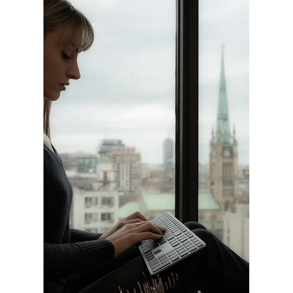 The Matias Backlit Wireless Aluminum Keyboard is a slim, aluminum, wireless keyboard with a similar layout to the familiar Apple Wireless Keyboard. It has four features that enhance your experience compared to the regular Apple Wireless Keyboard including: a numeric keypad, a rechargeable battery with a typical battery life of up to 1 year before needing recharging, can pair to up to 4 devices at the same time, and easily switch between the 4 devices with the press of a button, and it is backlit! You can control the brightness level, and turn it on or off.