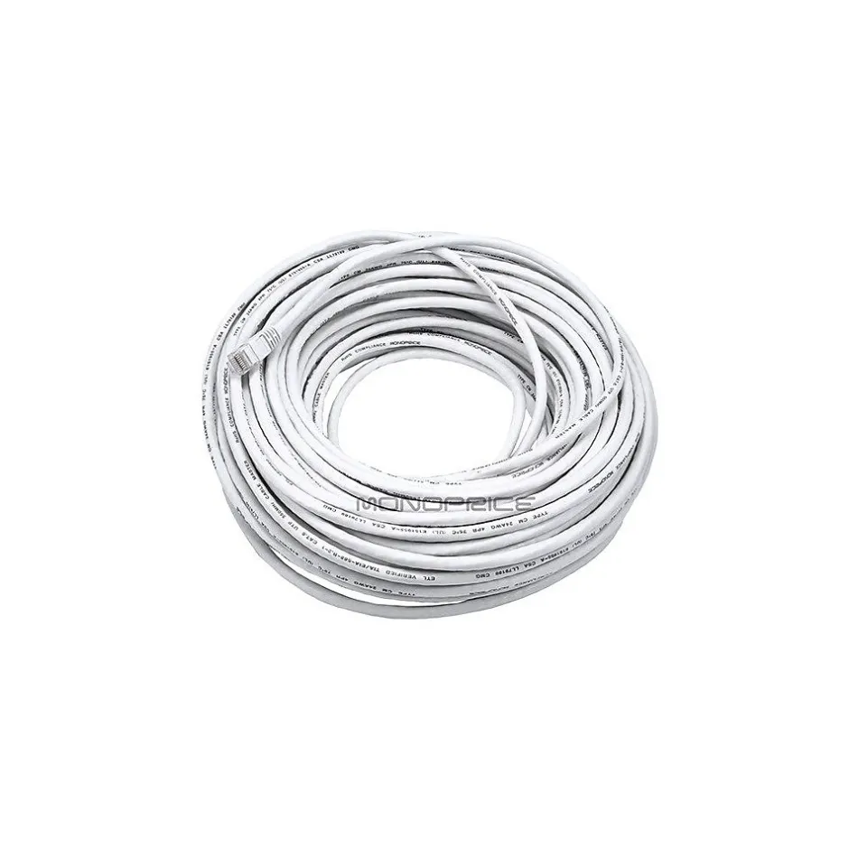 Monoprice® 100′ Cat5e UTP Ethernet network cable with a data transfer speed of 350 MHz has 50 micrometer gold plated contacts for enhanced conductivity. Cable in white color has snagless strain relief boots and provides reliable performance.