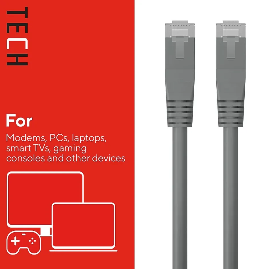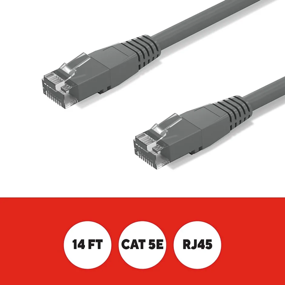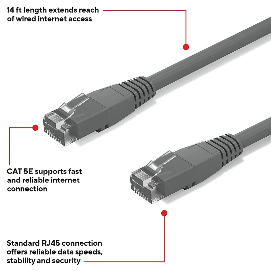 Connect high-speed network devices – like modems, PCs, laptops, smart TVs, gaming consoles and more – with this Staples TECH Ethernet cable. The 14-foot cable provides ample length to connect from across the room, while the CAT 5E configuration offers data transfer speeds up to 1000 Mbps for fast performance. This Staples TECH CAT 5E Ethernet cable has snag-free RJ45 connectors for an efficient and stable signal between compatible devices. Backed by Staples Brands 100% satisfaction guarantee, or your money back.