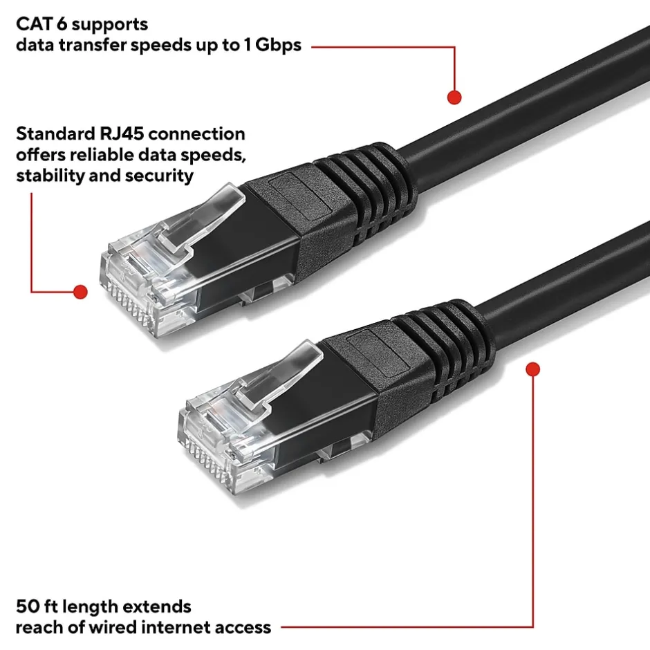 Connect high-speed network devices – like modems, PCs, laptops, smart TVs, gaming consoles and more – with this Staples TECH Ethernet cable. The 50-foot cable provides extra length to connect from across the room, while the CAT 6 configuration offers data transfer speeds up to 10Gbps for fast performance. This Staples TECH CAT 6 Ethernet cable has snag-free RJ45 connectors for an efficient and stable signal between compatible devices. Backed by Staples Brands 100% satisfaction guarantee, or your money back.