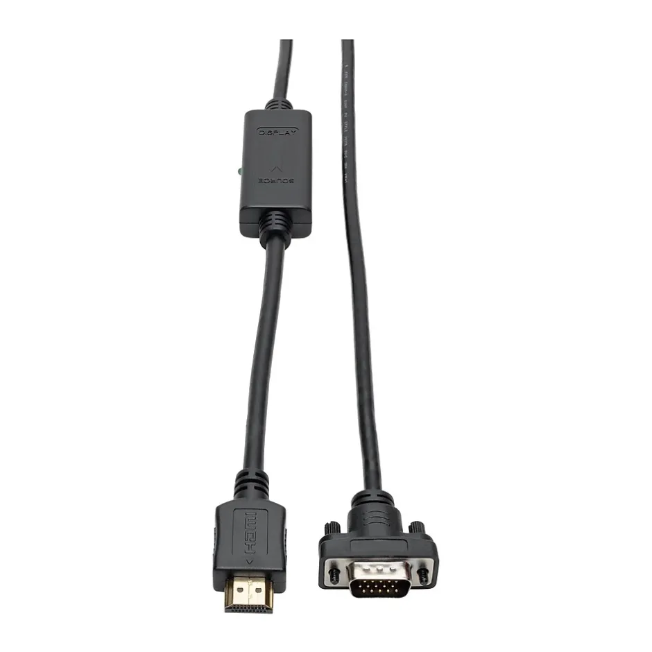 The Tripp Lite series HDMI to VGA Active Adapter Cable allows you to use your existing VGA display instead of investing time, effort and money into upgrading to a new HDMI display. The low-profile HD15 connector fits neatly into tight spaces without jamming between the monitor and wall or blocking nearby connections. Ideal for displaying video on a large monitor or digital sign, this six-foot converter cable supports high-definition video resolutions up to 1920 x 1200 at 60 Hz. No software or drivers are required. If additional power is needed, connect a USB cable (sold separately) between the cable’s USB Micro-B port and a USB wall charger or computer port. Foil and braid shielding delivers reliable, error-free signal quality and protection from EMI/RFI line noise that can distort or destroy data. The corrosion-resistant gold-plated HDMI connector and contacts provide maximum conductivity and minimize data loss. Integral strain relief gives the cable extra flexibility, reduces stress, and helps the cable and connectors move freely without cracking.
