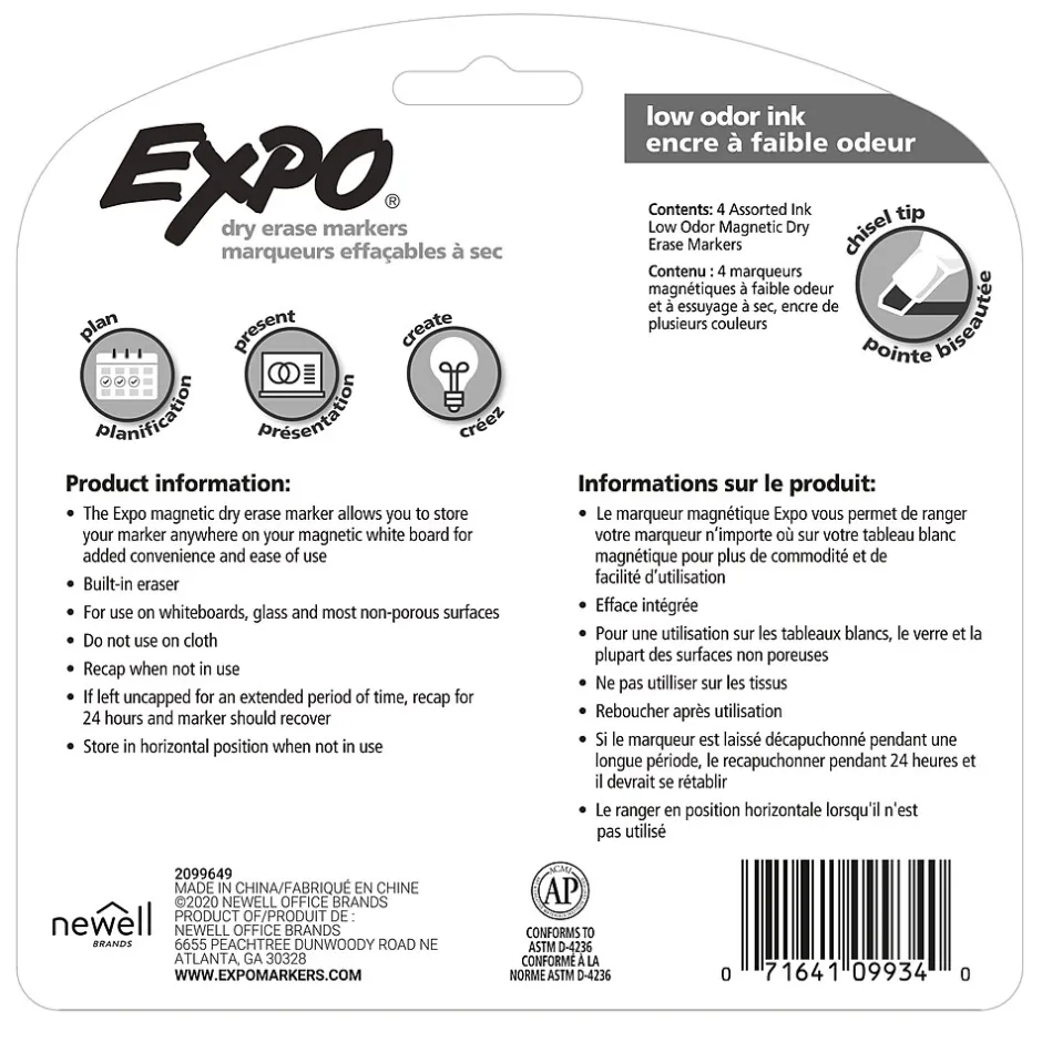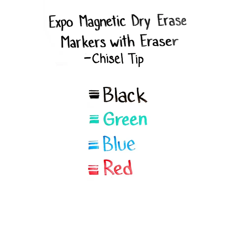 Draw diagrams or design presentations with this 4-count pack of EXPO dry-erase markers. The chisel tip lets you create wide or thin lines, and integrated magnets stick each pen to any metal surface for easy storage. The vivid colors of these EXPO dry-erase markers are visible from a distance and easily erased from whiteboards or other nonporous surfaces.