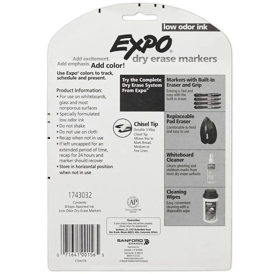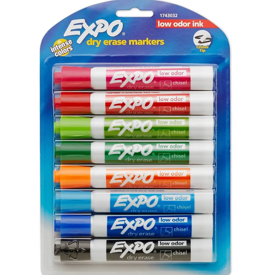 EXPO Low Odor Dry Erase Markers use a specially formulated, alcohol-based ink with virtually no odor. The chisel tip markers feature vivid ink that is quick-drying and easy to see from a distance. These dry erase markers write on whiteboards and most non-porous surfaces.