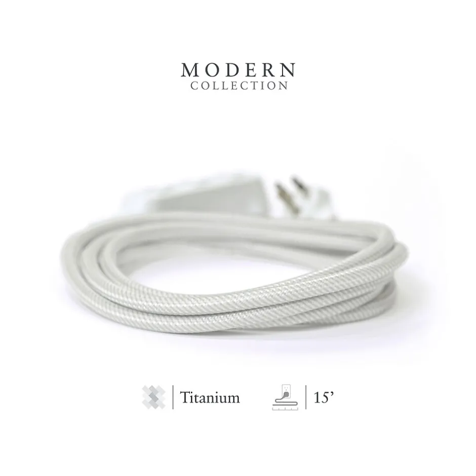 Plug in devices without leaving your desk using this extension cord. The 15′ length and right-angle plug access distant and hard-to-reach outlets, and the slim profile conserves space. This 360 Electrical Habitat Modern Collection 15′ braided extension cord has three AC outlets for multi-device connectivity.
