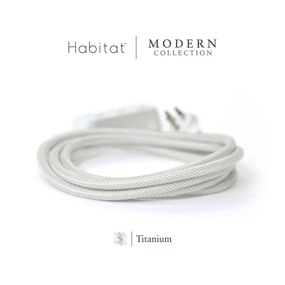 Plug in devices without leaving your desk using this extension cord. The 8′ length and right-angle plug access distant and hard-to-reach outlets, and the slim profile conserves space. This 360 Electrical Habitat Modern Collection 8′ braided extension cord has three AC outlets for multi-device connectivity.
