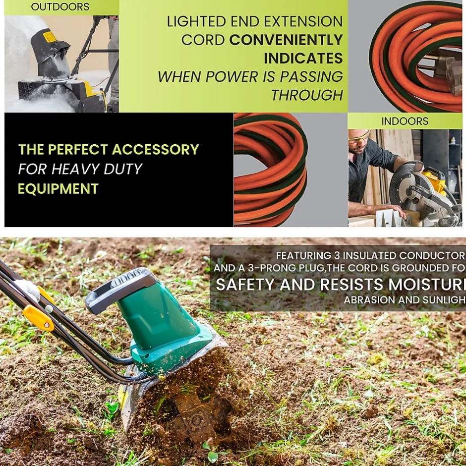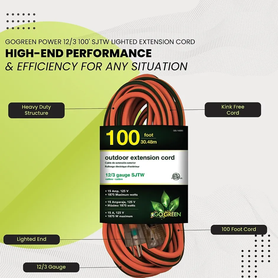 The GoGreen Power 12/3 Heavy-Duty Extension Cord is ideal to use for equipment and tools. It is designed to resist moisture, abrasion and prolonged exposure to sunlight. The extension cord has a lighted end and heavy-duty molded plugs. This contractor-grade cable is also ETL listed for safety with a maximum power rating of 1875 watts at 15 Amp and 125V. This item is specially designed for outdoor use.