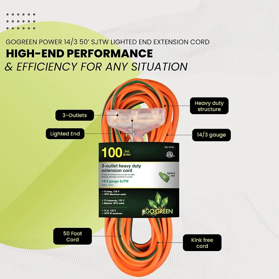 Update and improve the functionality of your home’s patio or garage with this GoGreen Power 3 outlet Heavy Duty Extension Cord, Lighted End. It will resist moisture, abrasion and prolonged exposure to sunlight for enhanced durability. This 3-outlet extension cord is ETL-certified. It offers the ability to turn one outlet into three outlets to help accommodate your power distribution needs. It’s ideal for use around your garage, your home and your work site. The plug illuminates to show when power is on to promote safe and convenient use.