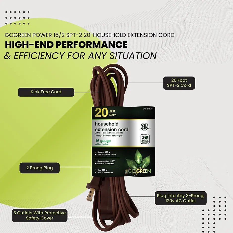 GoGreen’s 2-prong extension cord comes equipped with 3 outlets and is rated for indoor use only. Perfect for devices such as lamps, phone chargers, fans, heaters, and many other electronics. Rated at 125 Volts, the 2-prong cord can be plugged into a standard 3-prong 120V AC outlet. The 16 gauge kink-free cord is safe and reliable, providing superb insulation. Each extension cord is fixed with a safety cover for extra protection. There are 3 Extension Cords per order.