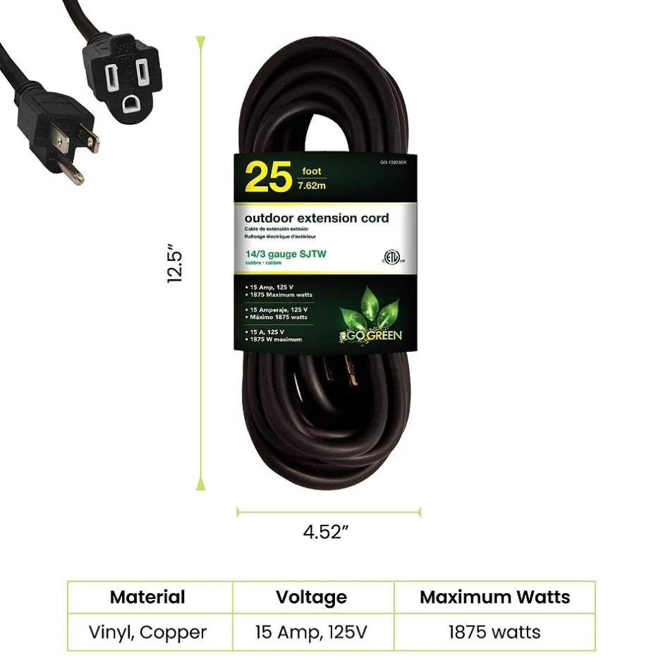 Increase your range with this GoGreen Power 14/3 Heavy Duty Extension Cord. It makes a smart addition to any collection of household supplies. This outdoor extension cord is extremely durable and stands up to the elements without issue. It resists moisture, abrasion and prolonged exposure to sunlight, making it dependable and long-lasting. Recommended for use with heavy-duty equipment and tools, the cord contains heavy-duty molded plugs.
