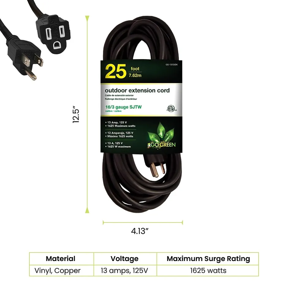 Increase your range with this GoGreen Power 14/3 Heavy Duty Extension Cord. It makes a smart addition to any collection of household supplies. This outdoor extension cord is extremely durable and stands up to the elements without issue. It resists moisture, abrasion and prolonged exposure to sunlight, making it dependable and long-lasting. Recommended for use with heavy-duty equipment and tools, the cord contains heavy-duty molded plugs.