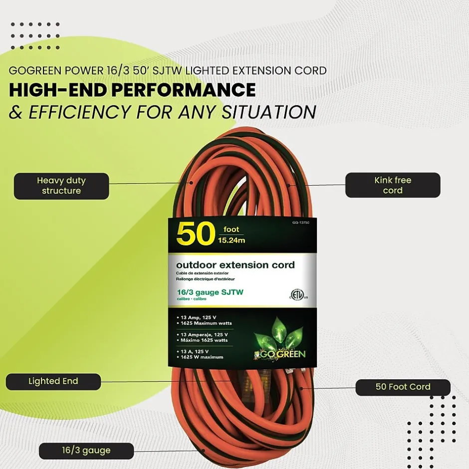 The GoGreen Power Heavy-Duty Extension Cord is ideal for multiple applications around your home’s exterior and garage. It resists moisture, abrasion and exposure to sunlight. The length of the outdoor extension cord allows you to cover a large area without the need for continuous stops to remove and replug. Use it to power your electric tools, lawn mower, to operate your generator and to provide lighting and music while entertaining. The cord is ETL listed and features a light on the end that shines when it’s in use.