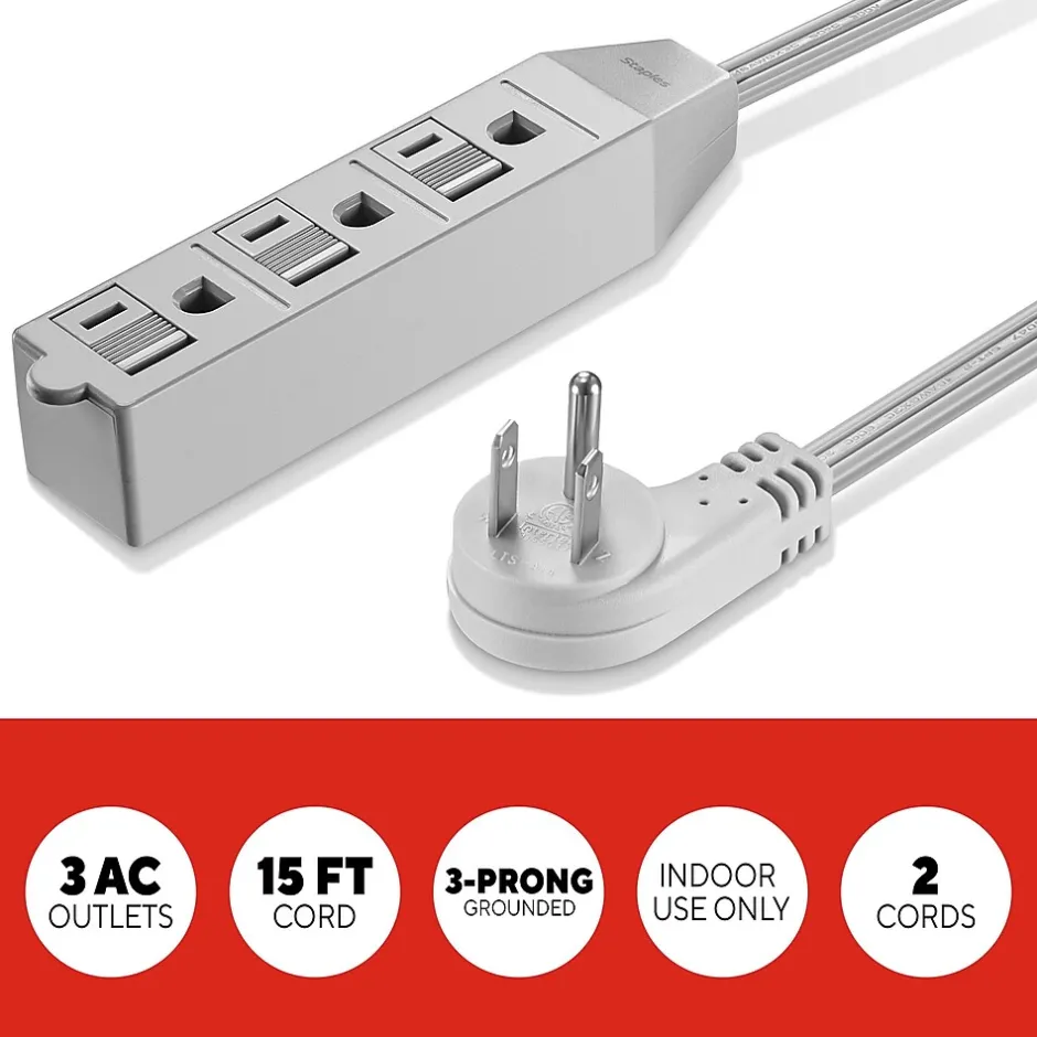 Stay powered up and plugged in with our 3-outlet power strip. The generous 15-foot cord lets you power items through out your workspace, no matter how forgotten the corner. Each outlet in the strip is grounded with a three-prong plug for safe connections, and plastic safety covers add an extra layer of protection to keep fingers and office accessories from plunging in. This extension cord is designed for indoor use, in dry areas. This extension cord is equipped with two cords and a flat, right-angle plug, making it easy to use in tight spaces or behind sofas or bookshelves. With a maximum capacity of 13 Amps, 125 Volts, and 1625 Watts, it’s made for lighter-duty jobs like powering light fixtures or lamps. Its sturdy 16-gauge construction combines flexibility and durability, so you get reliable power when you need it.
