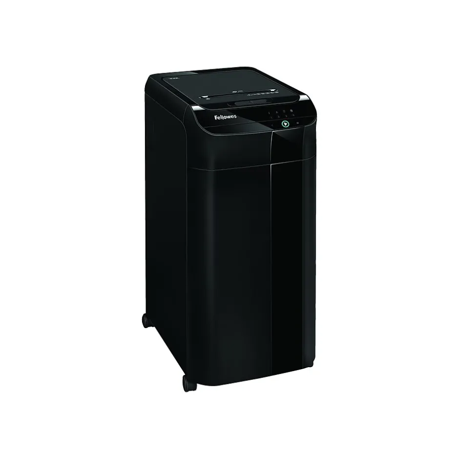 Make your way through thick stacks of old paperwork with this cross-cut shredder. The automatic feeder handles up to 350 pages for fast, efficient operation, while the powerful blades slice through glossy paper, credit cards, DVDs and CDs. With an automatic reverse function, this shredder prevents jams before they happen. Rolling casters make it easy to slide this shredder out of the way when it’s not in use. Featuring an 18-gallon waste bin, this Fellowes AutoMax cross-cut shredder keeps paper shreds contained until they’re ready for disposal.