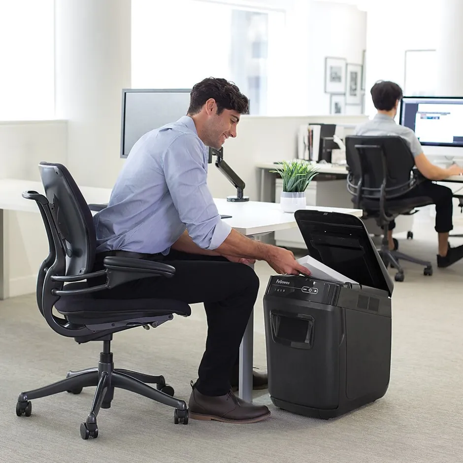 Get the power to automatically handle high-volume document disposal tasks with this AutoMax 150-sheet shredder. Featuring a built-in document feeder and AccuFeed technology, this machine automatically shreds 150 sheets of paper in under two minutes. The powerful motor offers up to 10 minutes of continuous use and lets this machine chew through sensitive materials such as CDs, DVDs and credit cards. This Fellowes AutoMax shredder makes it easy to remove paper jams with an auto reverse function.