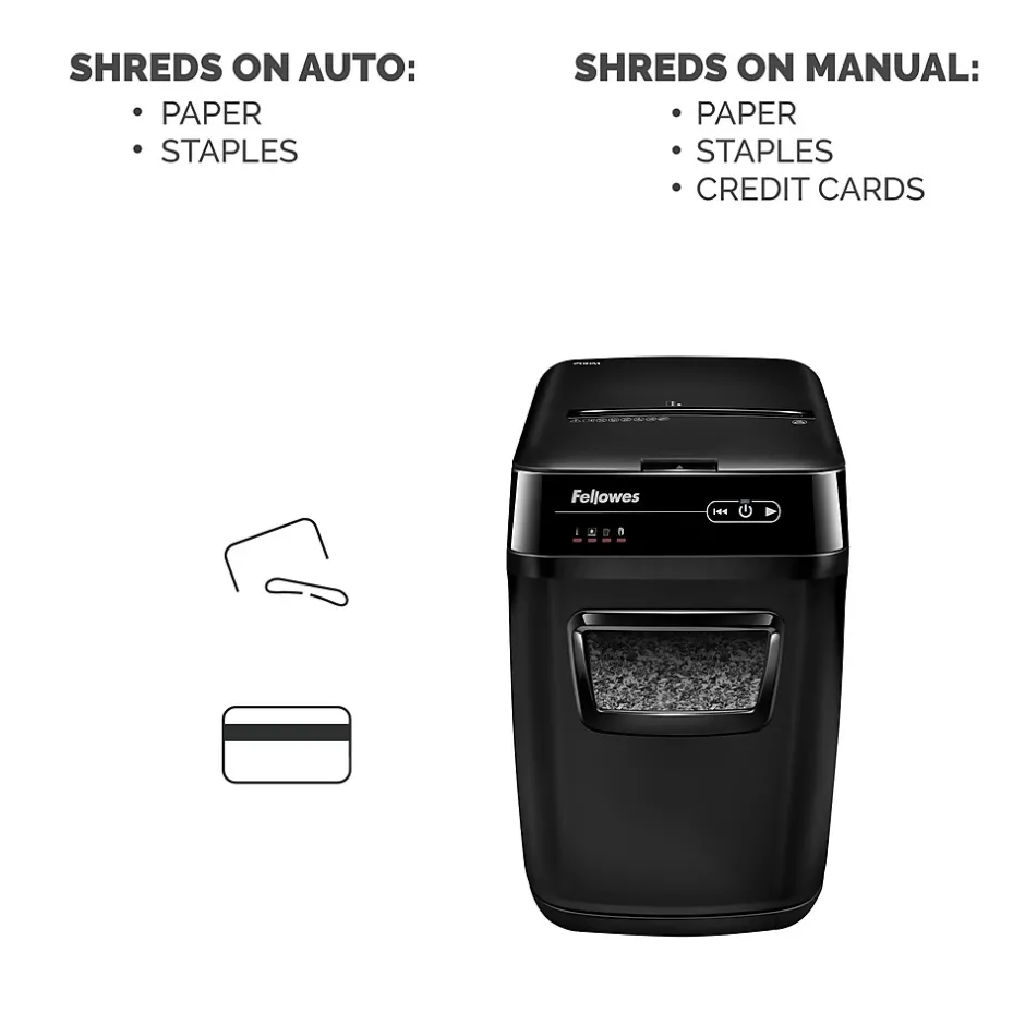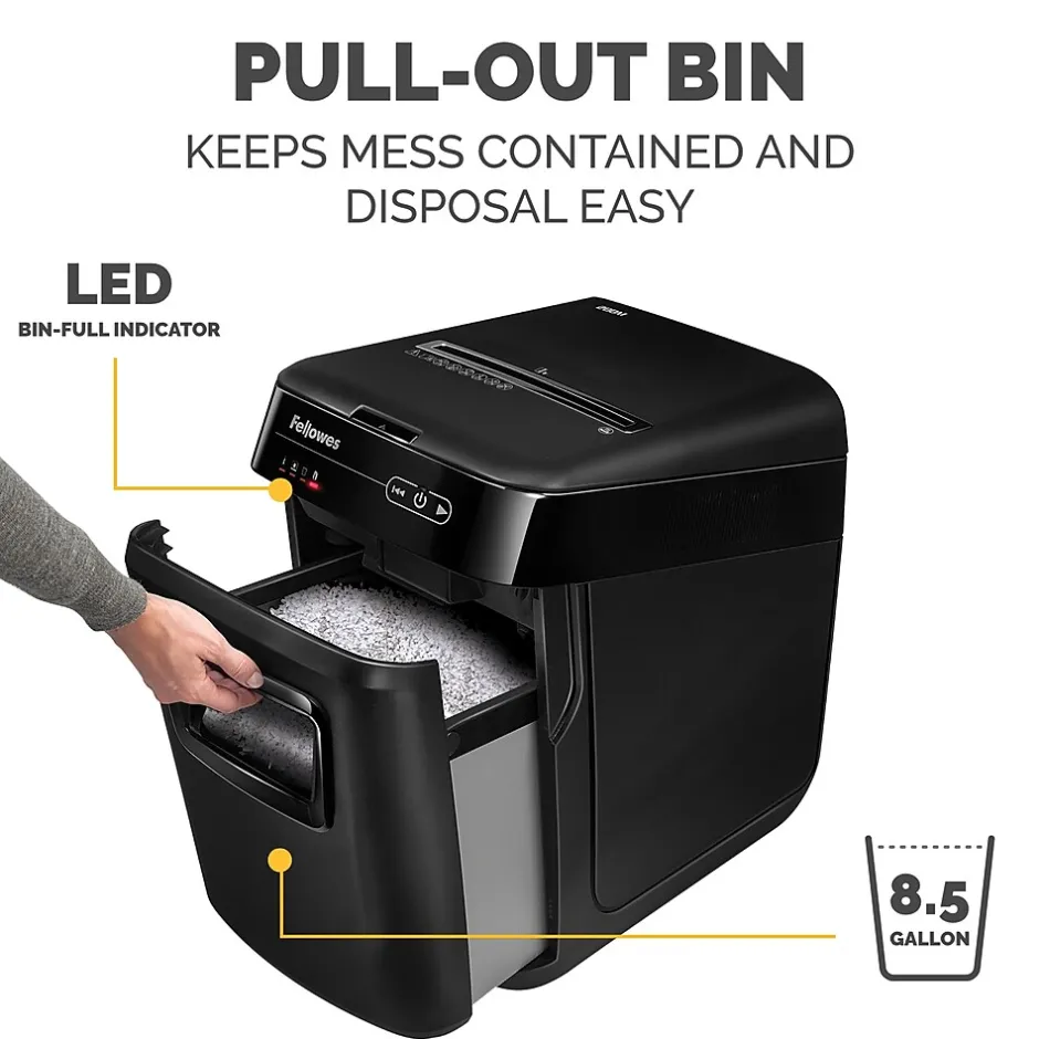 Inspired by the contemporary design of modern household appliances, the shredder works efficiently saving your time more. This Fellowes AutoMax 200M Autofeed Shredder perform like no other shredder on the market today. Its sleek profile with Patented AccuFeed System automatically shreds stacks of paper including documents with staples that easily integrates into any office environment. With spacious 8.5-gals. pull-out bin, it stacks of up to 200 sheets automatically and 10 sheets manually for 12 minutes into micro-cut particles, allowing shred jobs to be completed in one sitting. It includes advanced jam prevention, energy savings, and noise control features. The innovative LED touch screen allows ease of use for any user and the convenient, front-loading pull out drawer allows you to shred a few or even hundreds of documents per cycle.