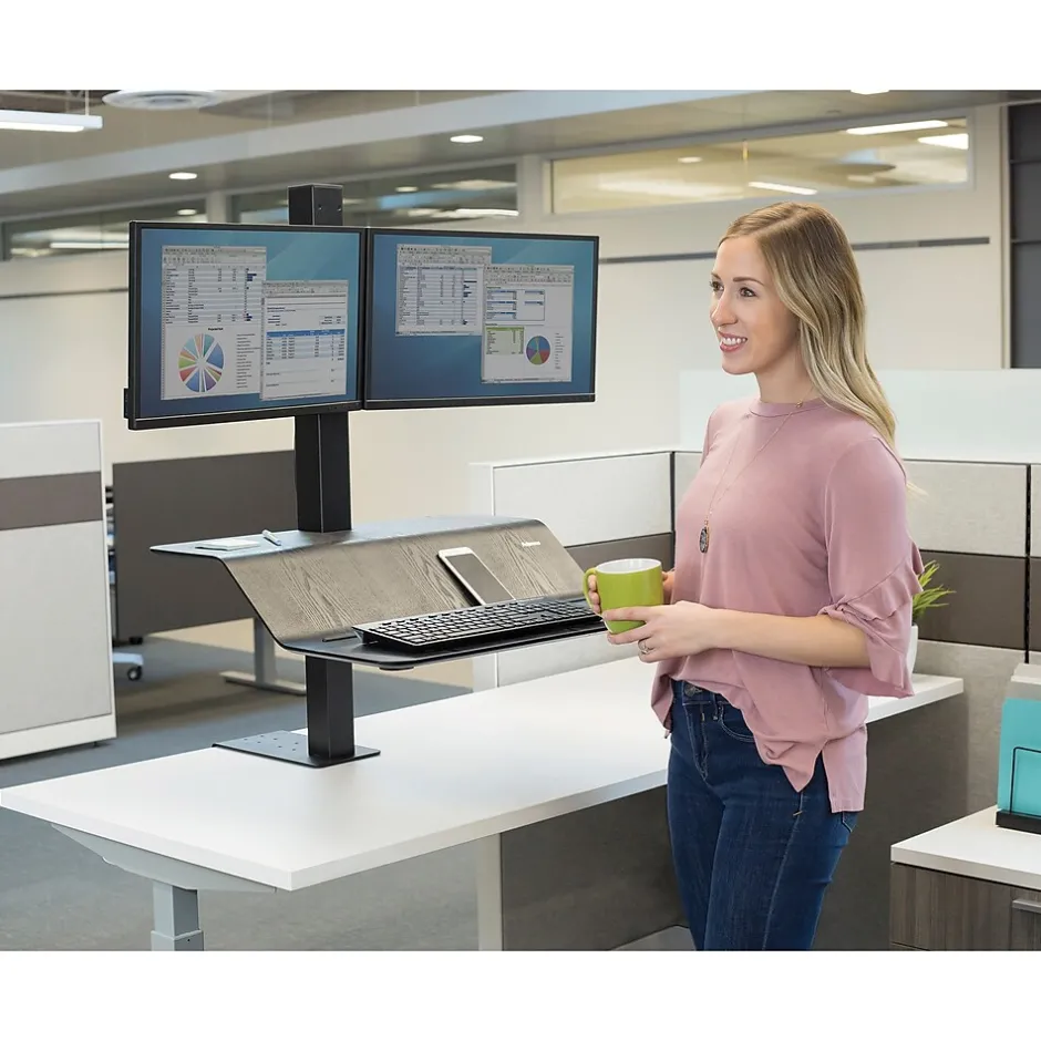 With Smooth Lift Technology, this workstation allows you to effortlessly transition from sitting to standing. This Fellowes Lotus VE Sit-Stand Workstation can accommodate monitors up to 20 lbs. and combined weight with 25 lbs. of total weight capacity. It is a much convenient channel that keeps all of your devices at your fingertips. It features 15 in. of vertical adjustment so that you can work in a position that’s perfect for you. This workstation keeps your desk organized and free of tangled cords for better use.